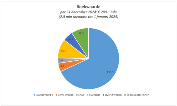 De boekwaarde is het totaal van de gerealiseerde kosten en gerealiseerde opbrengsten op een bepaald moment. In 2024 nam de boekwaarde met € 2,5 miljoen toe. De grondexploitaties hebben eind 2024 samen een boekwaarde van € 200,1 miljoen positief.