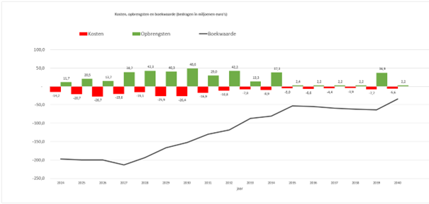 De omvang van deze boekwaarde wordt verklaard doordat bij gebiedsontwikkelingen de kosten uit gaan voor de baten. Dit wil zeggen dat voorinvesteringen in het gebied nodig zijn, voordat opbrengsten door gronduitgifte gerealiseerd worden. Onderstaande figuur laat de prognose zien van kosten, opbrengsten en het verloop van de boekwaarde van de geconsolideerde grondexploitaties.