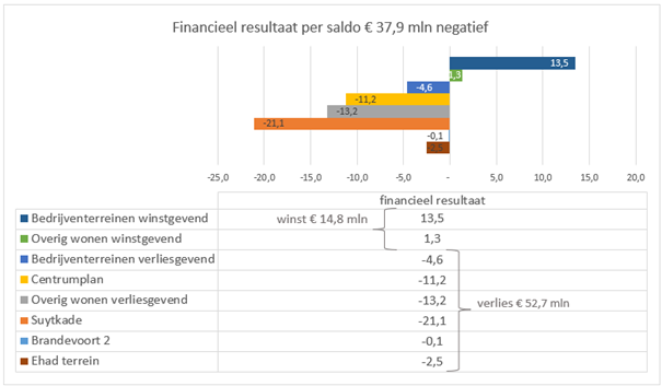 Om toch een indicatie te geven wat nu de effecten zijn geweest van de diverse oorzaken geven wij onderstaand een globaal beeld. Omdat deze effecten hun uitwerking hebben op zowel de winstgevende grondexploitaties als de verlieslatende grondexploitaties wordt in onderstaand beeld het volledige resultaat van € 54,9 miljoen op hoofdlijnen puntsgewijs toegelicht: