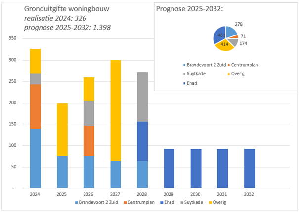 Op de huidige lopende grondexploitaties (inclusief de nieuwe grondexploitaties Ruusbroeclaan en Piet Blomplein) verwachten wij in de periode 2025 t/m 2032 in totaal voor 1.398 woningen bouwgrond te verkopen. In deze prognose is plandeel Brandevoort Nieuw (voorheen BSD) niet meegenomen. Omdat er nog geen grondexploitatie voor Brandevoort Nieuw is vastgesteld moeten wij volgens de verantwoordingsregels in de jaarrekening nog blijven rekenen met het oude plan Brandevoort totdat de nieuwe grondexploitatie voor plandeel Brandevoort Nieuw is vastgesteld door de raad. In de loop van 2025 zal meer duidelijk worden inzake het plandeel Brandevoort Nieuw. Het heeft daarom geen nut om de woningaantallen volgens het oude plan nog mee te nemen in de prognose. De prognoses van de grondverkopen met fasering voor de komende jaren staan hieronder.