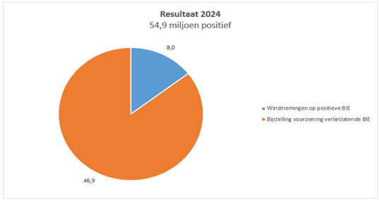 Bij de herziening van de grondexploitaties wordt zoals gezegd een nieuwe beste schatting gedaan van de verwachte eindresultaten op de grondexploitaties. Aan de hand van die nieuwe verwachte eindresultaten moet bepaald worden of er tussentijds resultaten genomen moeten worden op de grondexploitaties. Daarbij wordt een onderscheid gemaakt tussen resultaten op winstgevende grondexploitaties en verlieslatende grondexploitaties. Bij winstgevende grondexploitaties moet bepaald worden of er al tussentijds een winst genomen moet worden. Bij verlieslatende grondexploitaties moet bepaald worden of er meer of minder geld apart gezet moet worden in een voorziening om het verwachte verlies op de einddatum op te vangen. Het tussentijds resultaat 2024 is bepaald op € 54,9 miljoen.