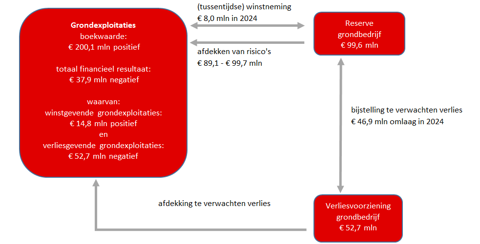 Voor de grondexploitatie geldt een gesloten circuit. Dit betekent dat resultaten op grondexploitaties (zowel positief als negatief) worden verrekend met de reserve grondbedrijf. Het jaarrekening resultaat van 2024 komt derhalve ten gunste van de reserve grondbedrijf via resultaatbestemming.