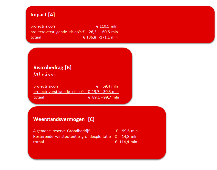 Het totaal aan risico’s van de project-specifieke en project-overstijgende risico’s samen ligt tussen de € 89,1 en € 99,7 miljoen. Deze bedragen liggen aanzienlijk hoger dan vorig jaar. Dit komt voornamelijk door de hiervoor uitgelegde grote stijging van het risicobedrag voor de projectspecifieke risico’s. Daarnaast is ook de impact van de scenario’s van de projectoverstijgende risico’s hoger dan vorig jaar. Doordat de nog te realiseren opbrengsten hoger zijn geworden ten opzichte van vorig jaar (op basis van het grondprijzenbesluit 2025 ) werkt een scenario waarin gerekend wordt met een grondprijsdaling ook harder door.