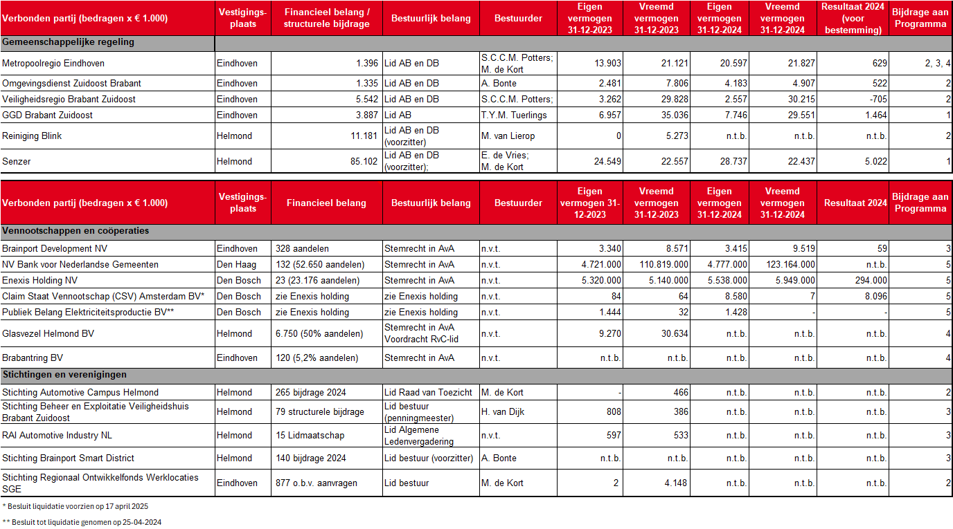 Verbonden partij (bedragen x € 1.000) | Vestigings-plaats | %username%: | Bestuurlijk belang | Bestuurder | Eigen vermogen 31-12-2023 | Vreemd vermogen 31-12-2023 | Eigen vermogen 31-12-2024 | Vreemd vermogen 31-12-2024 | Resultaat 2024 | Bijdrage aan Programma |